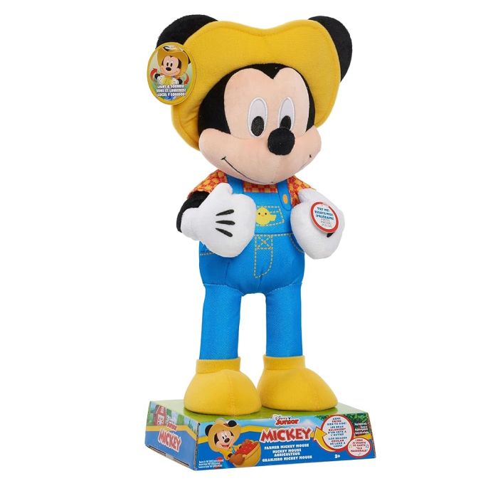 Standing approximately 15 inches tall, this adorable Disney Mickey Mouse plushie wears cute overalls, a colorful shirt, and farmer’s hat, ready to teach kids about farm animals. Activate lights and sounds by pressing Mickey's left hand. Hear Mickey Mouse say fun phrases and make animal sounds. Oink Oink! Watch the yellow ducky on his outfit light up as Mickey Mouse talks, flaps his arms, and sings the classic kids' song, “Old MacDonald.” Toddlers and preschoolers will love dancing and singing along with Mickey Mouse! The Disney Junior Farmer Mickey Mouse plush doll is made of super-soft mixed fabrics with embroidered features and excellent character detail.