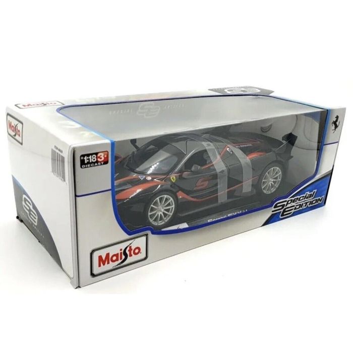 Maisto 1/18 scale diecast car model of Ferrari FXX-K Evo Series. Real rubber tires. Has steerable wheels. Officially licensed product. Has opening hood, doors and trunk. Made of diecast with some plastic parts. Detailed interior, exterior, engine compartment. Dimensions approximately L-9, W-4, H-3 inches. Please note that manufacturer may change packing box at any time. Product will stay exactly the same.